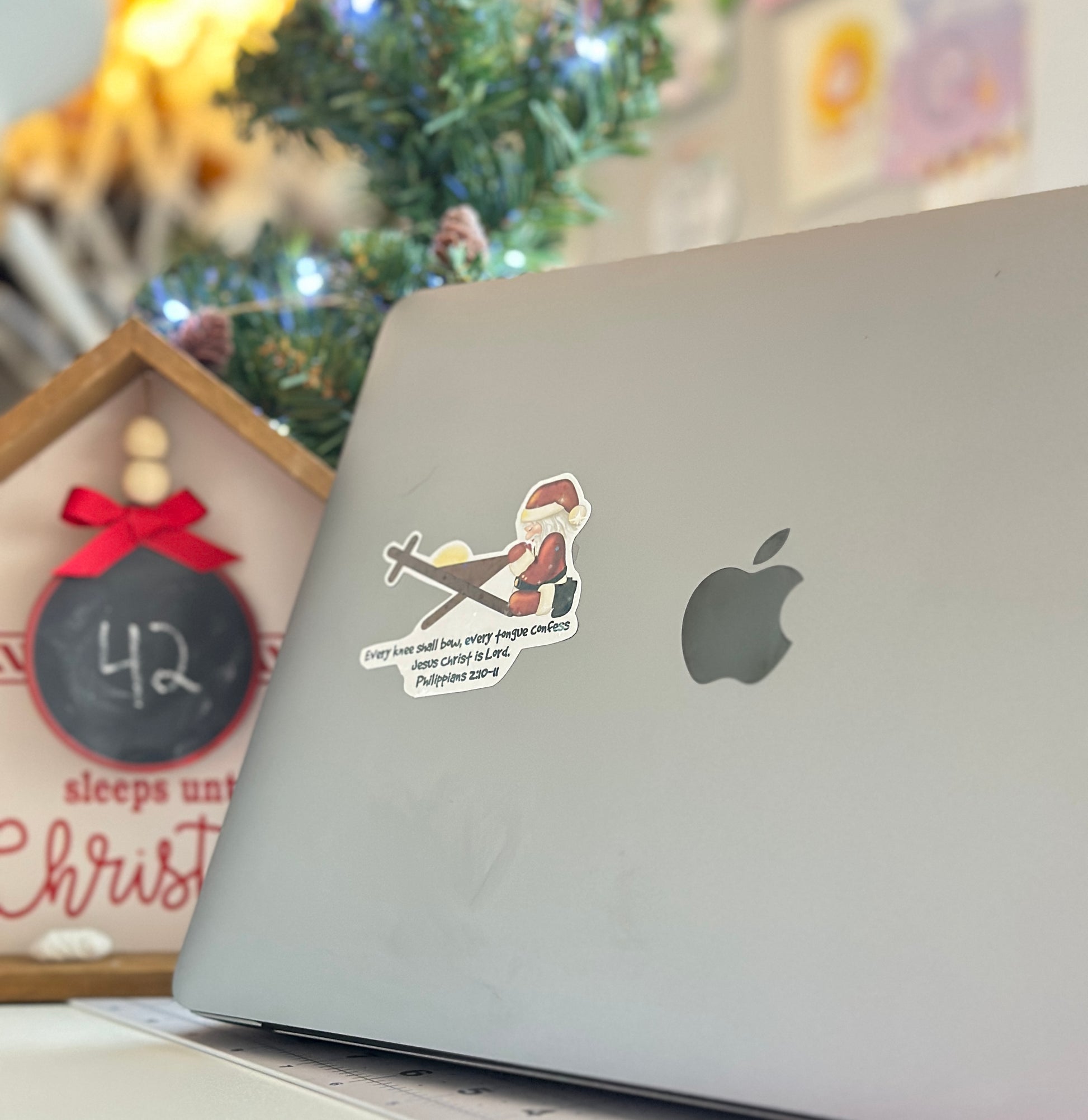 Bring the heart of Christmas to life with this die-cut sticker featuring Santa kneeling before Jesus in the manger—with a subtle nod to the cross behind Him. Inspired by Philippians 2:10–11, this illustration is a gentle reminder of the true meaning of Christmas: “that at the name of Jesus every knee shall bow…”